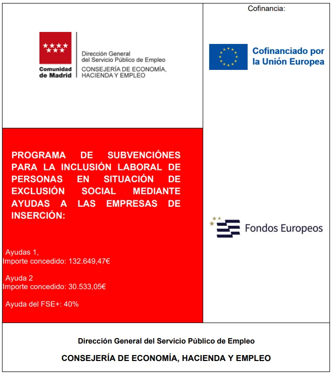 Como parte del proceso de transparencia de nuestra Empresa de Inserción, se publican las ayudas recibidas por parte de la Comunidad de Madrid, en el marco del Programa de ayudas para la integración laboral de personas en situación de exclusión social mediante ayudas a las Empresas de Inserción, líneas 1 y 2, correspondientes al ejercicio 2025.